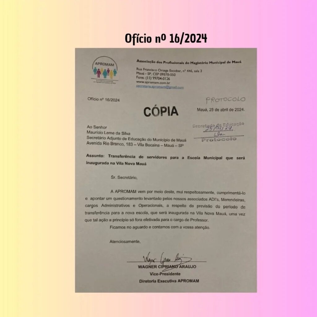 Transferência de servidores para a futura escola municipal na Vila Nova Mauá Autor do post:APROMAM Post publicado:25/04/2024 Categoria do post:Noticiais Você também pode gostar Dia Internacional de Pessoas com Deficiência 03/12/2024 Eleição do Conselho Municipal de Educação de Mauá 08/06/2021 Agradecimento Vereador Márcio Araújo 31/01/2021