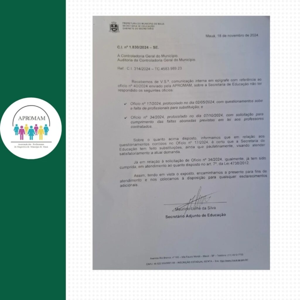 Mais uma vitória APROMAM. Enviamos ofício à Controladoria – Geral do Município solicitando respostas aos ofícios encaminhados para a Secretaria de Educação, que não foram respondidos, dentre as questões, está o direito a falta abonada dos servidores contratados.