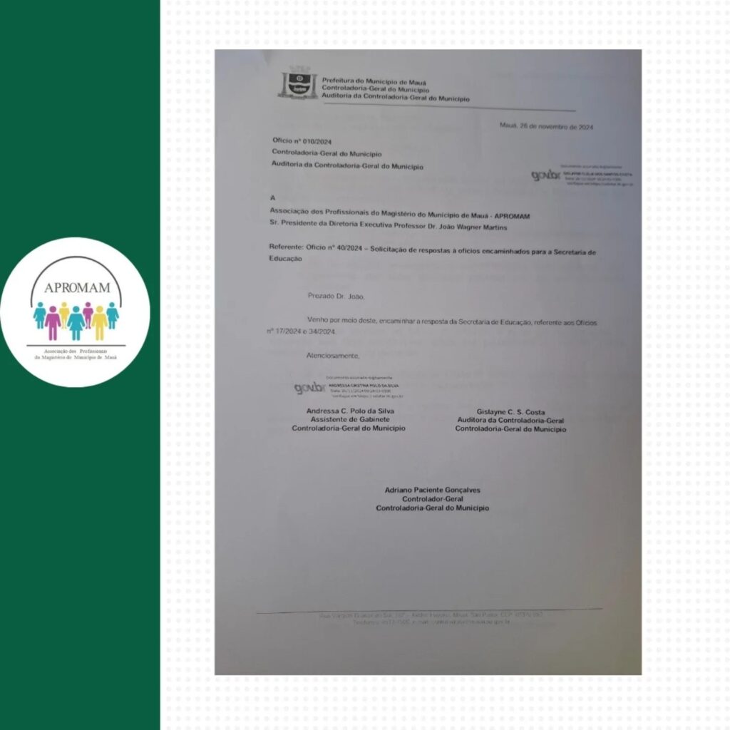 Mais uma vitória APROMAM. Enviamos ofício à Controladoria – Geral do Município solicitando respostas aos ofícios encaminhados para a Secretaria de Educação
